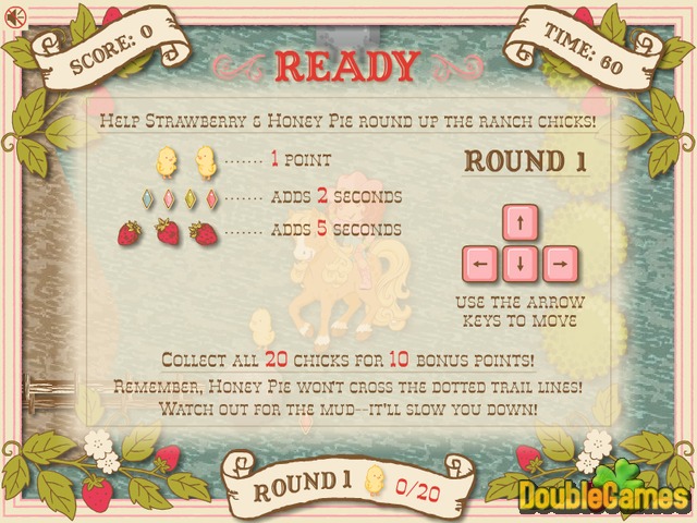 Ontmoet een schattig klein meisje genaamd Strawberry in het nieuwe gratis, online spel genaamd Big Country Fun. In dit avonturen spel zul je Strawberry en haar kleine paard helpen met het verzamelen van piepende kuikens. Des te meer je er verzameld, des te beter. Probeer de taak te voltooien voordat de tijd om is. En als je diamanten en aardbeien oppakt zul je extra seconden krijgen. Dit schattige en mooie spel zal je blijdschap en geluk brengen! Begin nu meteen gratis te spelen. Veel plezier!