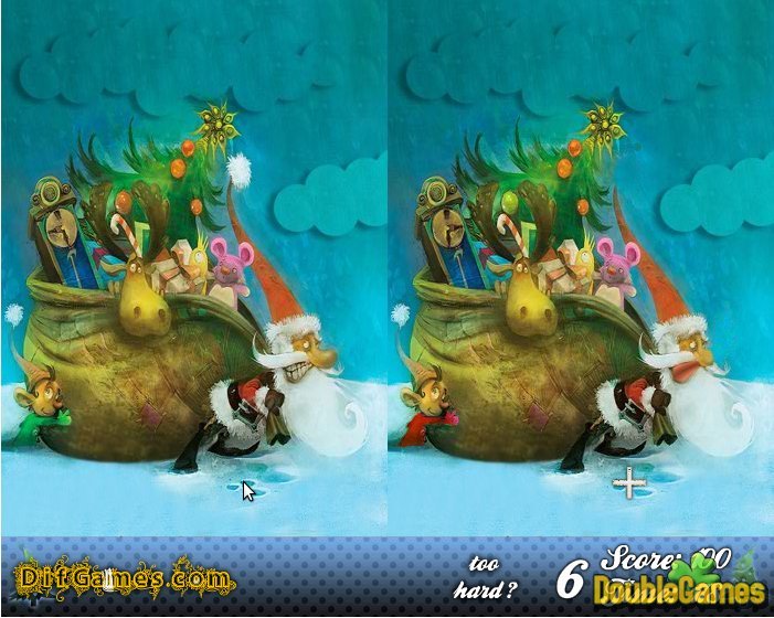 Nood om echte Kerstmis geest te voelen? Aarzel dan te beginnen niet om een verse online spel Kerstmis Geest te spelen! Geluiden amuserend, is niet het? In Kerstmis Geest bent u verschillen op een paar Kerstmis afbeeldingen te vinden. Het nummer van de verschillen is beneden verklaard uw uitdaging gemakkelijker te maken. Elke juiste klik brengt aan u 100 punten. Maar wees waakzaam! Elke fout verwijder één 5 punten. Er zijn enkele niveaus in het spel, daarom zult u door het vermaken met een en dezelfde Kerstmis illustratie niet geboord worden. Speel Kerstmis Geest online en creëer de stemming van uw favoriete wintervakantie!