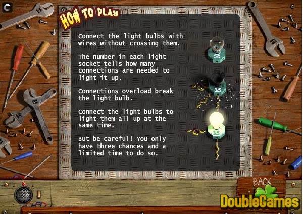 Daag uw geest uit die de juiste aansluitingen doet om de verduistering te vermijden! U zou gloeilampen met draden moeten verbinden zonder hen te kruisen. Het nummer in elke lichte contactdoos vertelt hoe veel aansluitingen worden nodig verlichten. Aansluitingen overbelasten breuk de gloeilamp. Verbind de gloeilampen om hen iedereen tegelijkertijd te verlichten. Maar wees voorzichtig u enkel hebt drie kansen en een beperkte tijd om zo te doen. Dit is een verslavend spel dat uw brein zal trainen dat de juiste aansluiting denkt aan.