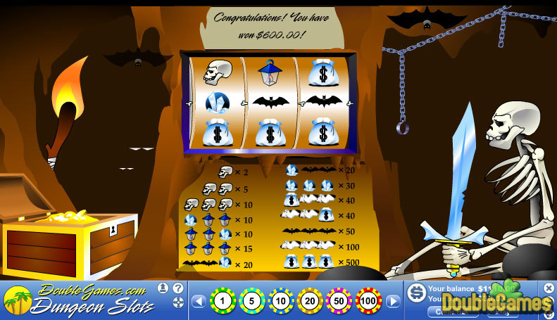 Spellen met een middeleeuws thema bewijzen dat ze heel succesvol zijn de laatste tijd. Daarom is het logisch dat het nieuwste slotmachine spel rond een middeleeuws thema speelt, met boeven en grotten etc, genaamd Dungeon Slots! Vele spellen ontwikkelaars baseren slotmachine spellen op strips of superhelden of zelfs andere spellen, dus het is geen verrassing dat je tegen een skelet zal vechten en de schat te stelen die hij op een jaloerse wijze bij zich wil houden! Zeg gewoon het geld dat je durft te wedden en dan zul je al snel genoeg meer geld verdienen! Maar wees bewust van het risico - als je al je geld inzet, dan kan je het ook allemaal in één keer kwijt raken! De graphics zijn uitstekend en wat eng, vooral als je bang voor skeletten bent! De muziek is zelfs prachtig, waarschijnlijk geïnspireerd door spellen zoals Skyrim en Dragon Age. Dit spel moet je hebben als je gek bent op slotmachine spellen, en misschien zullen wat vrienden van je het ook leuk vinden. Download het en win veel geld in Dungeon Slots. Win geld en laat het in je schatkist vallen!