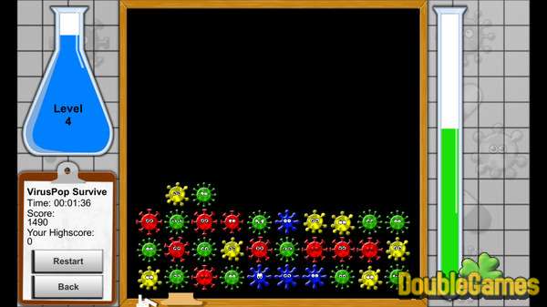 Verwijder de virussen door op de pillen te klikken om ze te vernietigen. Combineer groepen van drie op een rij die minstens één pil van dezelfde kleur bevatten. De game bevat ook de normale popgame-modi VirusPop, waarbij je virussen van dezelfde kleur gewoon bij elkaar moet zoeken. Er is een zen-modus, voor de ontspannen speelstijl en zonder tijdgebrek. deze modus voor een ontspannende game-ervaring. Blitz-modus is voor een snel spel van slechts 2 minuten, waarbij je moet proberen zoveel mogelijk punten te scoren. En tot slot begint de Survival-modus met een gedeeltelijk gevuld level. Het level begint langzaam vol te lopen en het spel eindigt als het level vol is. Elke modus kan op 6 verschillende niveaus worden gespeeld, met verschillende grootten en hoeveelheden viruskleuren.
