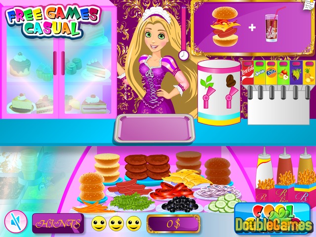 Verwelkom naar de nieuwe schattige online Tijd Management spel onder het titel Rapunzel Plezier Café! Na de goed bekende prinses Rapunzel ontsnapte van haar toren, zij besliste nieuwe mensen te ontmoeten en maak vrienden. Om met de burgers zij te communiceren beslist haar eigen hamburgercafé te openen. Help haar kok de hamburgers, uitvoeringsdranken en dient de klanten. Kijk uw tijd en vergewis u ervan koken niet neemt u veel tijd. Speel Rapunzel Plezier Café net nu en voor prijs. Geniet van!