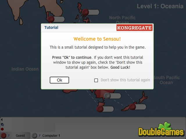 Sensou is een strategiespel dat zal interessant zowel voor kinderen als volwassenen. Het doel van het spel is om de macht op 6 continenten te grijpen en te nemen over de hele wereld! Plaats uw troepen op je territoriums en verdedigen van uw gebied of vallen sommige vijandelijke gebieden te couquer hen. Denk dat grondig en verplaats uw troepen nauwkeurig te verslaan de vijand. Voor een gedetailleerde beschrijving van Sensou Lees de ingame handleiding. Wat wacht je nog op? Speel gratis flash game Sensou nu!
