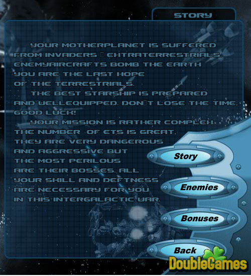 Uw Moeder planeet wordt aan indringers buitenaardse wezens geleden. Vijandvliegtuigen bombarderen de Aarde. U bent de laatste hoop van de aardse. Het beste ruimteschip is bereid en uitrust goed. Maak de tijd, succes niet los! Uw missie is liever complex. Alle uw vaardigheid en behendigheid zijn noodzakelijk voor u in deze intergalactische oorlog niet losmaakt de gelegenheid om deze verslavende intergalactische strijd deelnemen aan, regeren uw ruimteschip met pijlen en met Ruimte schiet. Kleurrijke landschap, 4 soortarmen, iedere episodevoltooiing met … IT is een bewegend spel!