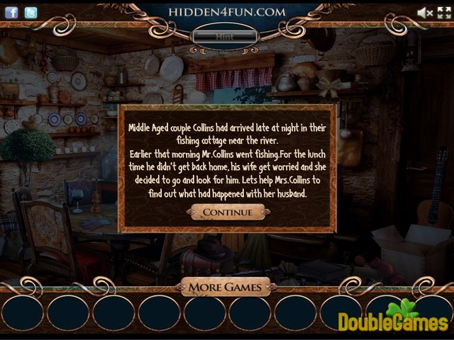De zomer is de juiste tijd om te vissen, vind je niet? Als je het hiermee eens bent en het maar al te graag wilt proberen, maak je dan klaar voor een intense vakantie aan de oever van een rivier in het nieuwe Hidden Object genaamt The River Cabin! Mr. Collins was gaan vissen en verdween plotseling. Nu moet zijn arme vrouw hem vinden en jij gaat haar helpen. Kijk overal en verzamel het bewijs, ga door al de levels in dit spel heen. Speel The River Cabin nu helemaal gratis en kom erachter hoe het spel eindigt.