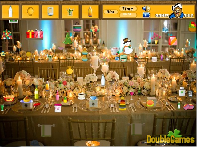 Iedereen wil organiseren het perfecte huwelijk en leef gelukkig ooit later! Er is veel warboel na de voorname huwelijkviering in een van de beste restaurants in de stad en u moet alles op zijn plaats zetten! Doe het in een nieuwe opwekken Verborg Voorwerpspel Huwelijk Ontvangst! Demonstreer uw beste aandacht, snelheid en andere vaardigheden en vind de voorwerpen van de gegeven lijst! Begin om Huwelijk Ontvangst net nu online en totaal voor vrij te spelen, herstel de bankethal en verhuur het poetst opnieuw!